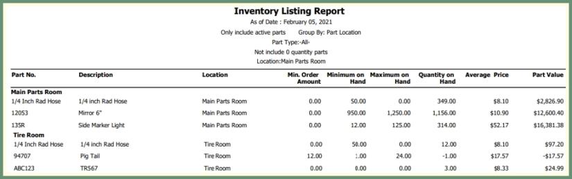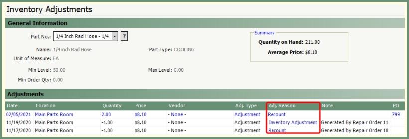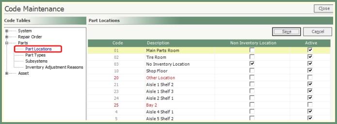 Prior to creating parts, there will need to be code tables setup for Part Locations, Part Types, Subsystems and Inventory Adjustment Reasons.