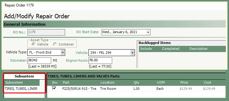 Placing a part in a subsystem will filter the available parts to be applied to a repair order to only the parts within the selected subsytem.