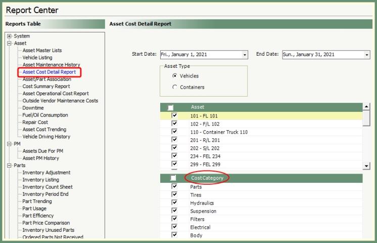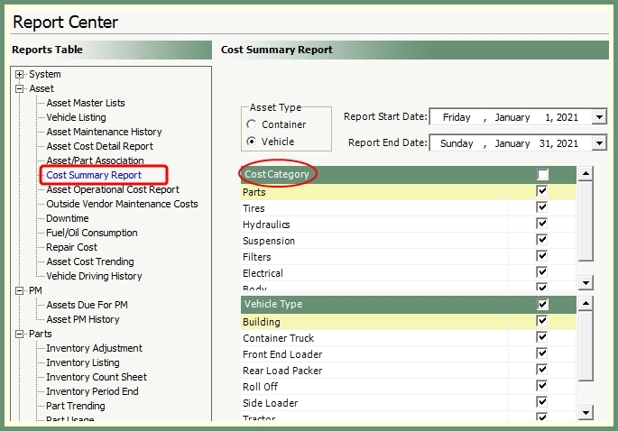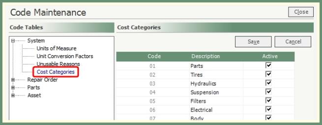 Group parts into categories to be applied for reporting on the Cost Summary and Asset Cost Detail.