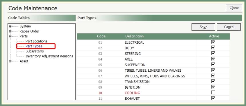 1. Active will be selected by default. Remove the active setting to mark a part type as inactive.