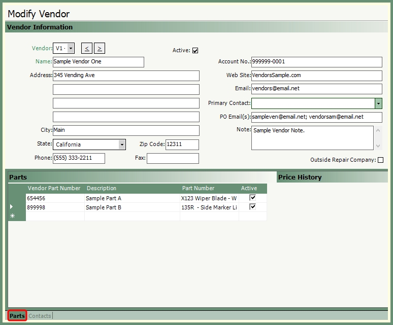 Prior to ordering parts, a list of your Vendors will need to be created and associated to parts created in Part Maintenance.