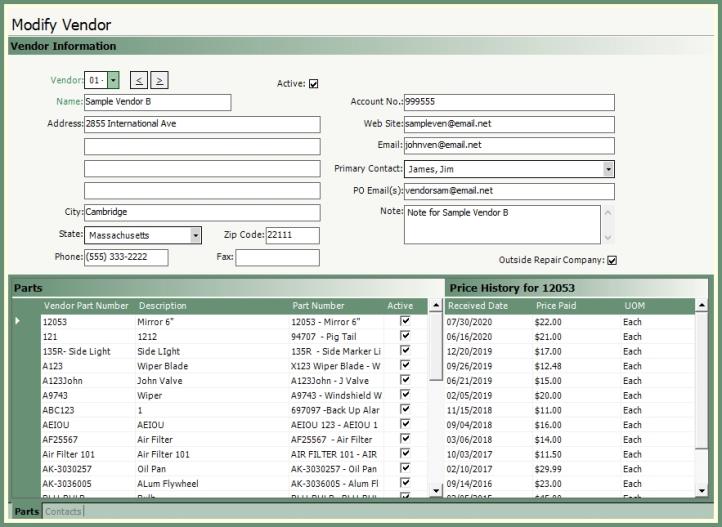 Add and modify the vendors to apply when ordering parts and entering third party repair orders.