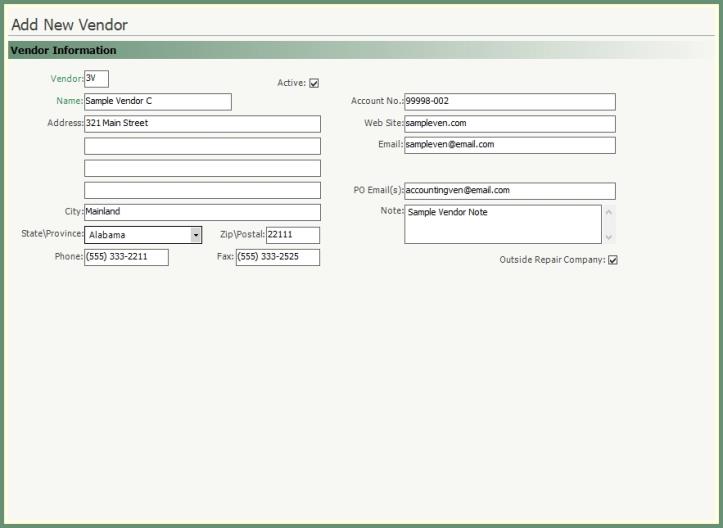 The Web Site & Email fields can be populated with the vendor's website and contact email address.