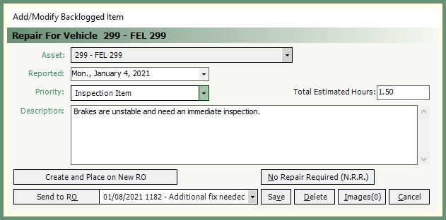 • Send to RO: Displays existing open repair orders to send this backlogged item to. Item is sent to repair order immediatelyClosed.
