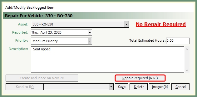 • No Repair Required (N.R.R.): Closes the backlogged item. If recalled, No Repair Required will be displayed in red and Repair Required (R.R.) can be selected to re-open the backlogged itemClosed.