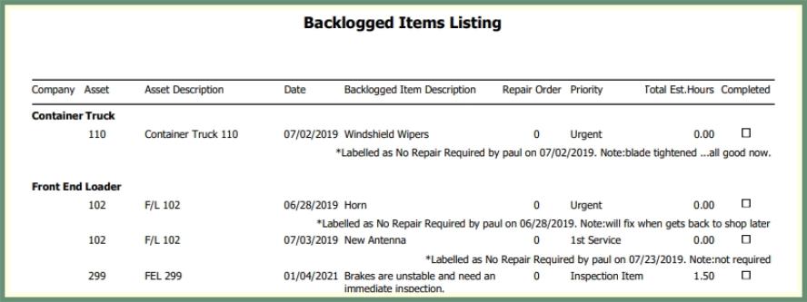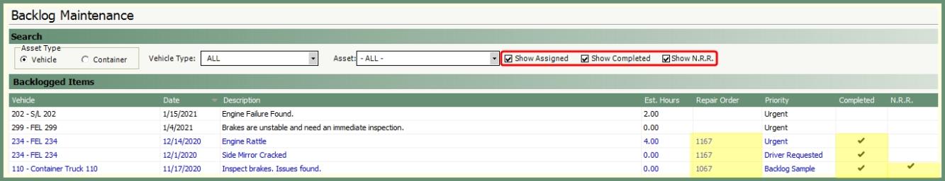 N.R.R.: Displays a check mark in the N.R.R. column for backlogged items marked as no repair required.