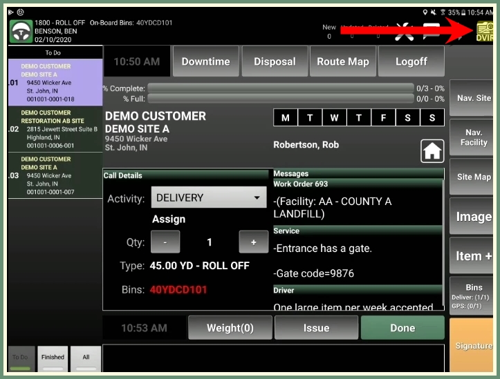 4. Drivers can view the status of vehicle repairs by reviewing the inspection report on the tablet by clicking DVIR in the upper right corner. See more about DVIR Center here.