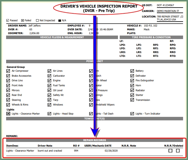 5. Assigned Repair Order numbers will be displayed if one exists for the DVIR item.