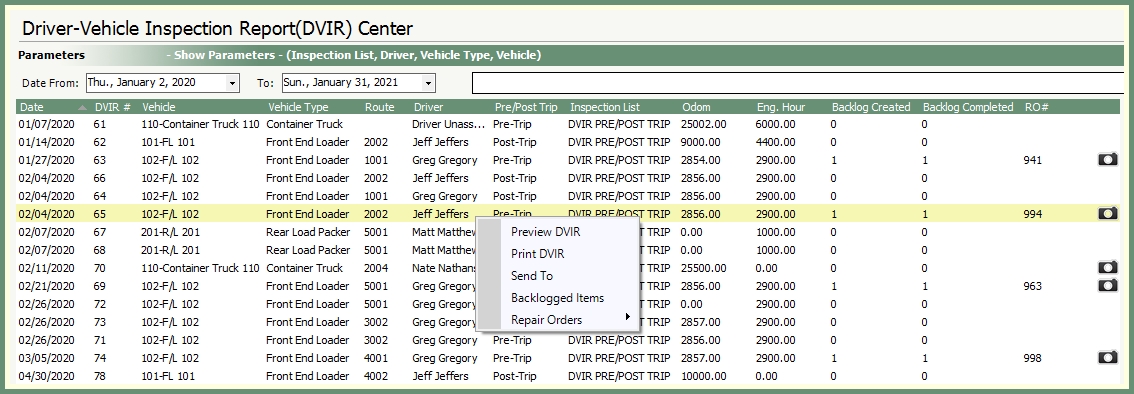 6. Right click on a DVIR# to preview, print or send DVIR's, view backlogged items and repair orders.