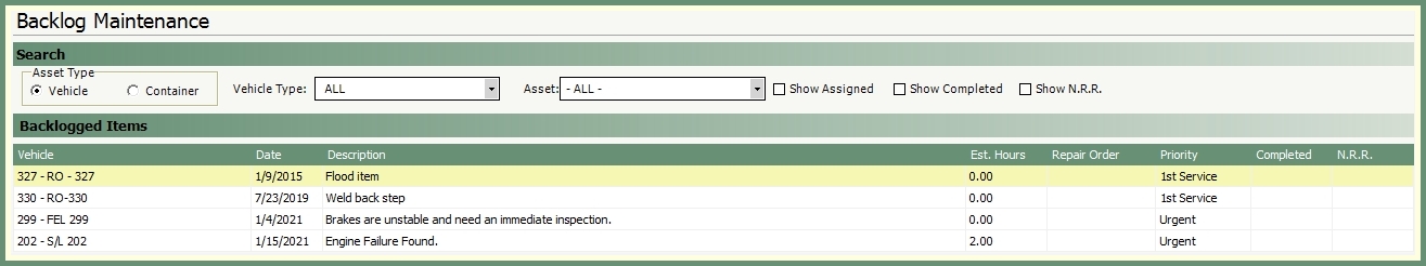 1. The grid will default to all incomplete unassigned vehicle backlogged items.