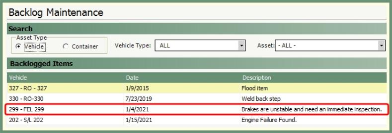Following driver inspection failures, a backlog item will automatically be created for the asset in Backlog Maintenance.
